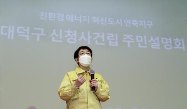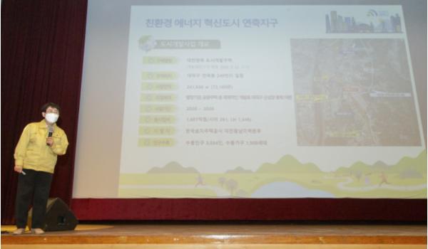 주요내용은 연축지구의 혁신도시와 찾아 올 변화, 대덕구가 꿈꾸는 혁신도시, 신청사 건립방향 등 연축지구를 자연과 인간이 공존하는 친환경 에너지스마트 혁신도시와 전국 최고의 그린뉴딜 모범도시로 조성한다는 계획이다