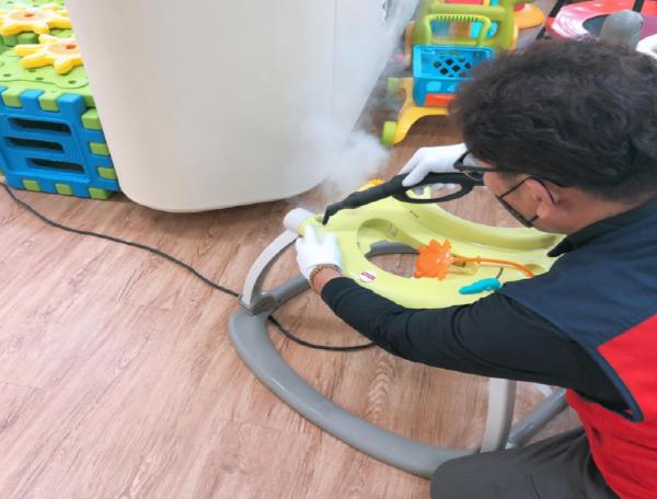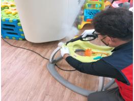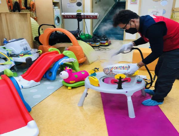 이천시육아종합지원센터 아이랑 카페 1?2호점 놀이체험실의 놀이기구, 장난감, 부모쉼터, 도서실, 수유실, 프로그램 및 강의실 등도 국내 유일 특허출원 살균·소독 전문 업체를 선정하여 대대적인 소독을 실시하였고 보다 매일 일 3회 이상의 소독, 매월 방역업체의 소독 등을 방문하여 세심하게 체계적인 단계별 소독을 강화하고 있다.
