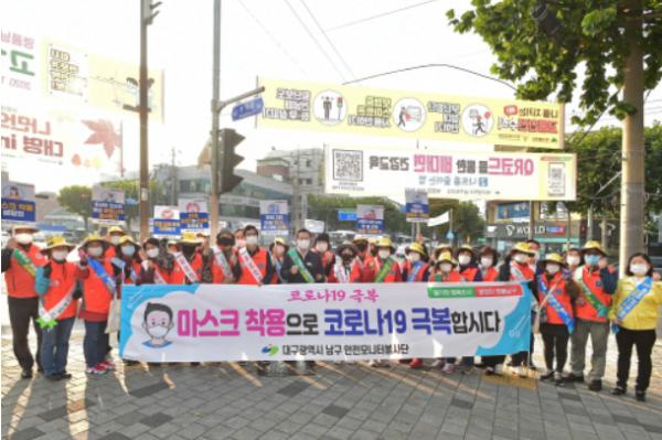대구광역시 남구 재난안전대책본부에서는 지난 27일, 남구청네거리에서 안전모니터봉사단 등 60여명과 함께 ‘코로나19 감염 차단을 위해 가을여유는 가족단위로 집 근처에서 안전하게 즐기세요’ 캠페인을 펼쳤다.