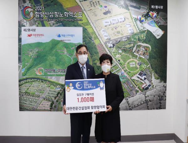 이날 구매 약정식에서는 엑스포조직위원회 김종순 사무처장과 대한전문건설협회 경남도회 함양협의회 최춘자 회장 등 관계자가 참석한 가운데 함양산삼항노화엑스포 예매 입장권 1,000매 구매를 약정하였다.