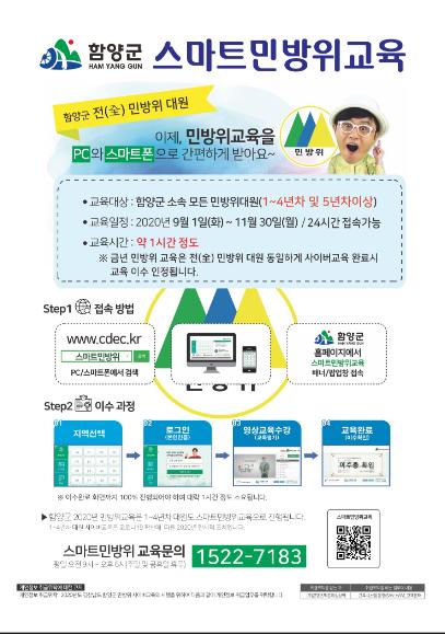 9월 1일부터 11월 30일까지 3개월 동안 진행되는 민방위대 사이버교육은 PC나 스마트폰을 이용해 함양군 홈페이지나 스마트 민방위교육(cded.kr)에 접속한 뒤 본인인증을 거쳐 수강할 수 있다.
