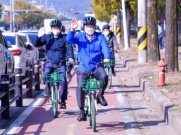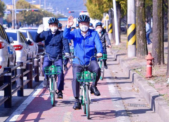 이용섭 시장은 시민들과 함께 직접 자전거를 타고 월전공원에서 평동역까지 이동하며 자전거도로 여건을 살핀 뒤 평동역에서 생활형 자전거도로에 대한 시민의견을 경청했다.