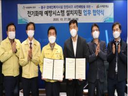 대전 동구는 27일 구청장 접견실에서 화재 안전시스템 IT벤처기업 ㈜에프에스와 IoT(사물인터넷) 기반 스마트 전기화재 예방시스템 구축을 위한 협약식을 개최했다.