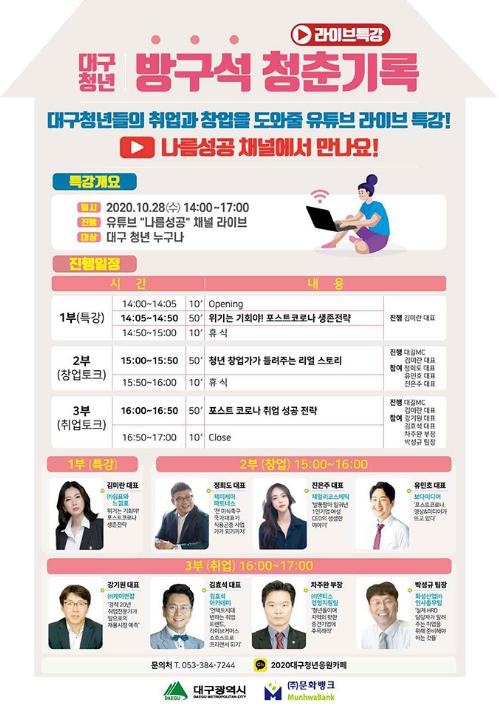 대구시와 ㈜문화뱅크는 코로나19로 취업에 어려움을 겪고있는 지역 청년들의 취·창업 지원을 위해 ‘대구청년 방구석 청춘기록 라이브 특강’을 진행한다.