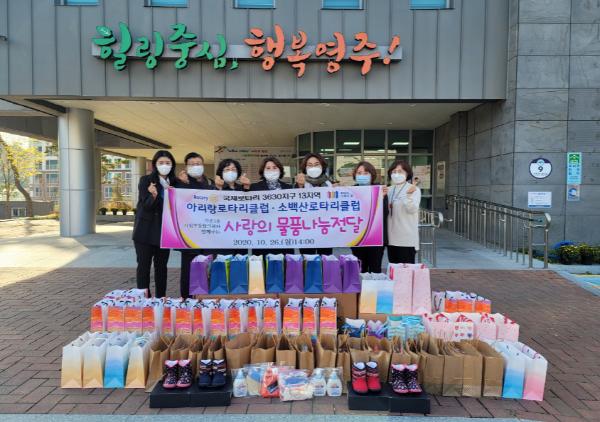 영주아리랑로타리클럽(회장 박은주)과 풍기소백산로타리클럽(회장 공애경)은 지난 26일 가흥1동 행정복지센터에서 사랑의 후원물품 전달식을 가졌다.