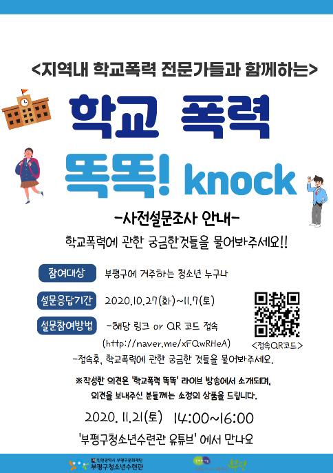 부평구 청소년수련관이 오는 11월 7일까지 학교폭력 예방활동인 ‘학교폭력 똑똑! Knock’의 사전 설문조사를 실시한다.