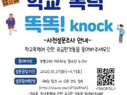 ‘학교폭력 똑똑! Knock’은 오는 11월 21일 실시간 유튜브 방송으로 진행하는 학교폭력예방활동으로, 설문조사는 학교폭력의 원인 및 필요한 예방대책 등의 문항으로 구성됐다.