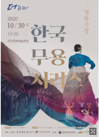 ‘정동극장-한국무용시리즈’은 10월 30일(금) 오후 7시 1회 공연 될 예정이며, 기타 공연문의 및 예매는 옥천문화예술회관 홈페이지 또는 043)730-4891~2으로 문의하면 된다.