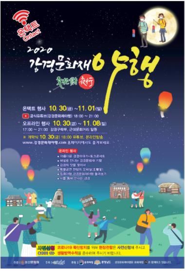 온택트 행사는 오는 10월 30일부터 11월 1일까지 3일 간 ‘2020 강경 문화재 야행’공식 유튜브 채널을 통해 진행되며, 야간 문화재 관람 및 전시, 체험 등의 오프라인 프로그램은 11월 8일까지 10일간 진행된다.