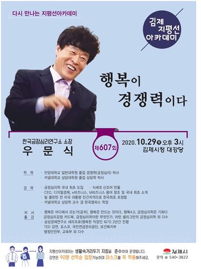 10월 29일에 열리는 제607회 강연은 “세상을 이기는 배움의 힘”이라는 테마에 맞추어 코로나 19로 일상생활의 즐거움을 잃고, 삶에서 무기력함과 우울함을 느끼는 시민들과 함께 행복을 찾는 것이 아닌 만드는 방법에 대하여 알아볼 예정이다.