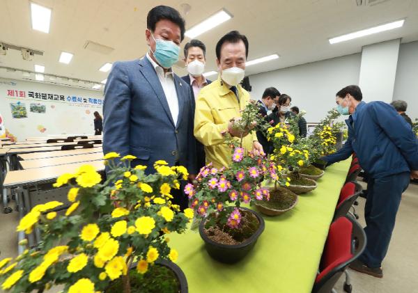 전시에 앞서 군은 28일 오후 농업기술센터에서 서춘수 군수와 국화분재 교육과정 수료생 등이 참석한 가운데 ‘국화분재 교육 수료식’을 개최하였다.