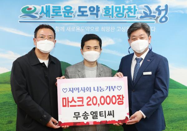 무송엘티씨(대표 이홍석)는 10월 28일 고성군청을 방문하여 코로나19 예방을 위한 마스크 2만장을 전달했다.