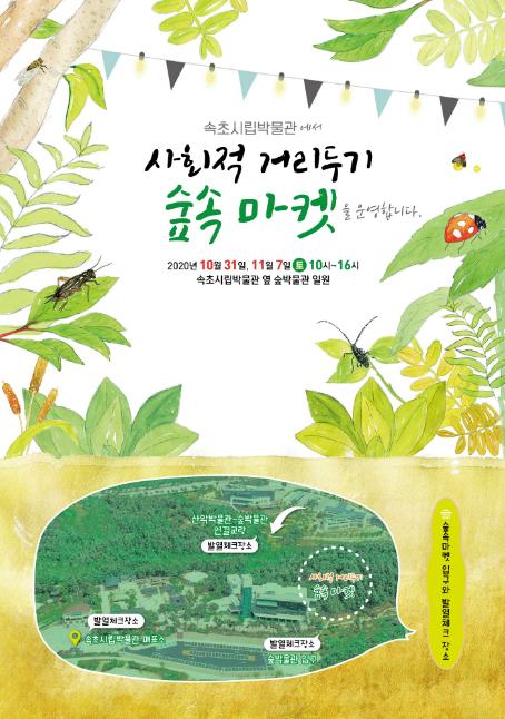 속초시립박물관(관장 김상희)은 10월 31일과 11월 7일 토요일 오전 10시부터오후 4시까지 “사회적 거리두기 숲속 마켓”을 숲박물관 내 전망쉼터 등을 활용해 관광두레(PD. 엄기동)와 공동으로 개최할 계획이라고 밝혔다. 속초시립박물관 주변으로 국립산악박물관과 국립등산학교 그리고 숲박물관이 조성되면서 자연스럽게 형성된 박물관 콤플렉스타운에 많은 관람객이 방문하여 관람하고 체험하여 이 지역을 활성화하는 데 목적을 두고 처음으로 시도하는 사업이라는데 큰 의미가 있다고 할 수 있다.