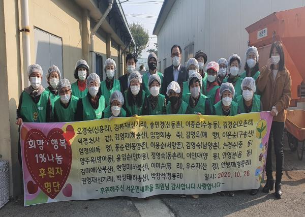안성시 서운면 새마을부녀회(회장 권영자)에서는 지난 27일 희망·행복 1% 나눔 후원을 통해 지역주민에게 나눠줄 밑반찬 재료를 구입하여 사랑의 반찬 나눔 봉사활동을 실시했다.