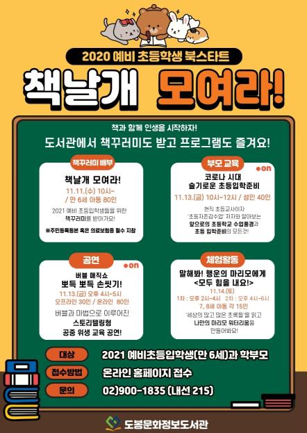 도봉구 도봉문화정보도서관은 11월 11일부터 만 6세?초등 예비 입학생을 대상으로 ‘초등 북스타트 책꾸러미’ 배부와 ‘책날개 모여라’ 프로그램을 운영한다.