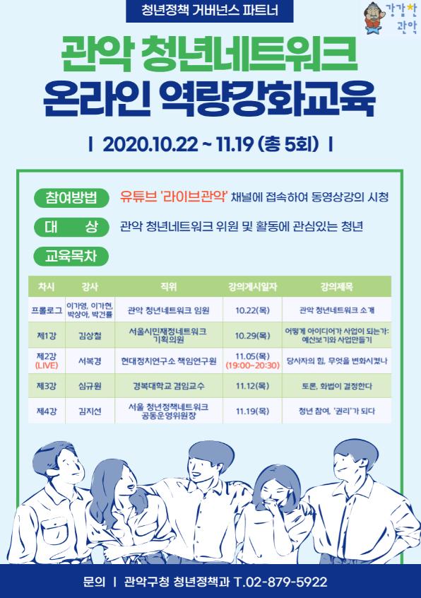 특히, 11월 5일(목) 진행되는 제2강은 저녁 7시부터 유튜브 ‘라이브관악’ 채널에서 청년의 변화를 주제로 생방송으로 강의가 진행되며, 채팅창을 통해 시청자들과 실시간으로 질의응답시간을 가질 예정이다.