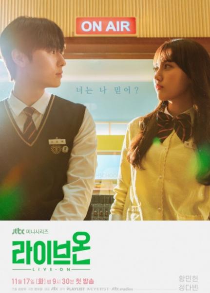 '라이브온'은 오는 11월7일 오후 9시30분 첫방송된다. 수상한 목적을 가지고 방송부에 들어간 서연고등학교 셀럽 '백호랑'(정다빈 분)이 엄격한 방송부장 '고은택'(황민현 분)을 만나 겪게 되는 상극 케미 로맨스 드라마다.