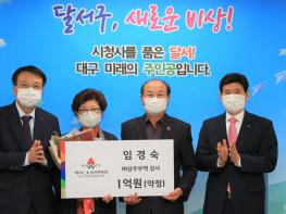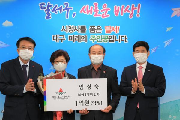 대구 달서구는 임경숙 ㈜삼우무역 감사(53년생)가 10월 28일, 달서구청장실에서 임경숙·주천수 ㈜삼우무역 회장 부부, 이태훈 달서구청장, 김수학 대구사회복지공동모금회 회장 및 관계자들이 참석한 가운데 사회복지공동모금회의 1억 이상 개인 고액기부자 클럽인 아너 소사이어티 회원에 가입했다고 밝혔다.