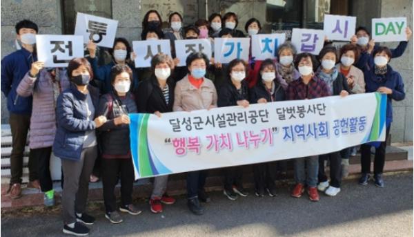달성군시설관리공단은 지난 26일 화원 전통시장에서 ‘전통시장 가치갑시데이(day)’ 행사를 개최했다고 밝혔다. 지역주민과 임직원은 화원시장을 방문하여 물품을 구매하고 음식을 먹는 소비 활동을 펼쳐 관내 소상공인을 돕고 코로나19로 침체된 지역 경기 회복을 위해 힘을 모았다.