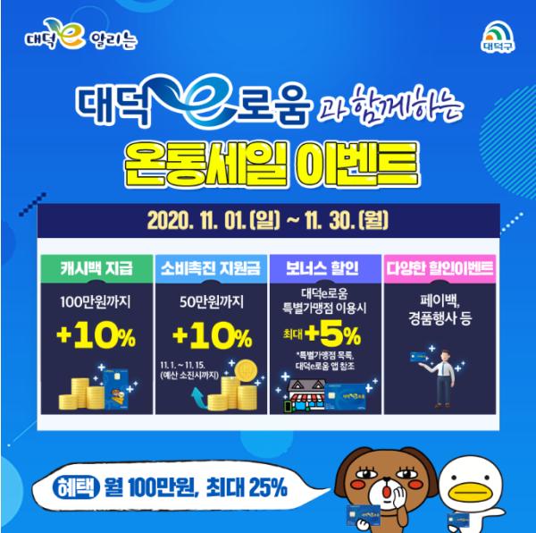 대전 대덕구가 29일 코로나19로 침체된 지역경제를 살리기 위해 ‘2020 코리아세일페스타’와 연계해 11월 1일부터 30일까지 한 달 간 ‘대덕e로움과 함께하는 온통세일’을 개최한다고 밝혔다.