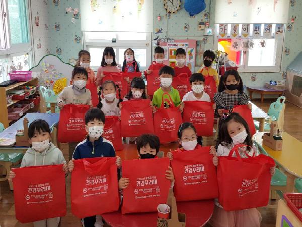 건강꾸러미는 코로나 시대에 맞게 원아를 직접 대면하지 않고 교육자료와 마스크, 금연스티커북, 마스크 스트랩 등 건강물품을 담아 전달했다. 교육 동영상은 보육시설내 교사에게 전달해 시설내 원아들이 시청할 수 있도록 했다.