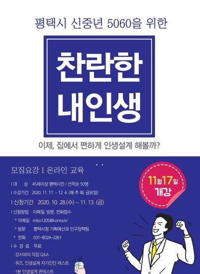 ‘찬란한 내 인생!’은 평택시 거주 45세 이상을 위한 인생 재설계 프로그램으로, 온택트 시대에 걸맞게 온라인으로 교육한다.