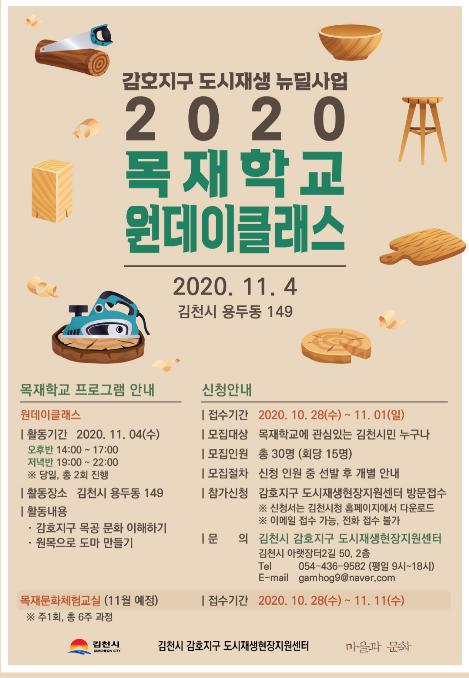원데이 클래스 참가자 모집·접수는 10월 28일부터 11월 3일까지 E-Mail 및 현장접수(주말 및 공휴일 접수 불가)이며, 목재문화체험교실 모집·접수는 11월 11일까지 모집한다. 목재·목공에 관심이 있는 김천시민은 누구나 신청할 수 있다. 또한 자세한 문의는 감호지구 도시재생현장지원센터(☎054-436-9582)에서 안내를 받을 수 있다.