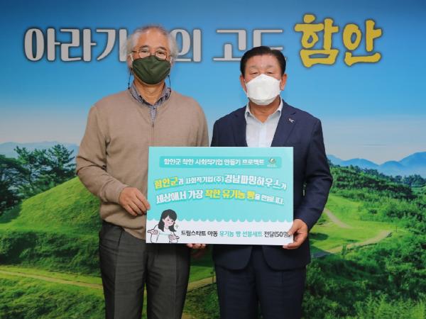 사회적기업인 ㈜경남파밍하우스(대표 김두영)는 29일, 함안군청을 방문하여 관내 드림스타트 아동들을 위해 ‘유기농 빵 선물세트’50개(150만 원 상당)를 기부했다.