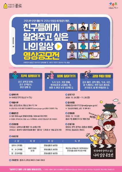 종로구는 코로나19로 일상생활이 위축된 청소년에게 활력을 불어넣기 위해 10월 26일(월)부터 11월 20일까지 「‘알려주고 싶은 나의 일상’ 영상 공모」 를 진행한다.