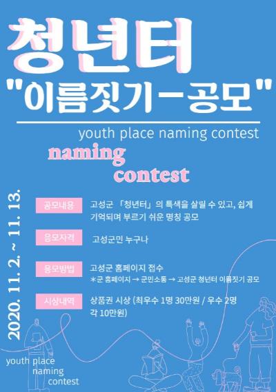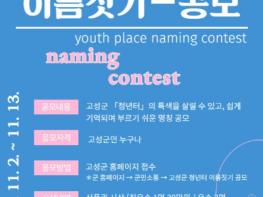 고성군은 청년 활동 활성화를 위해 조성되는 ‘청년터’명칭을 11월 2일부터 13일까지 공모한다.