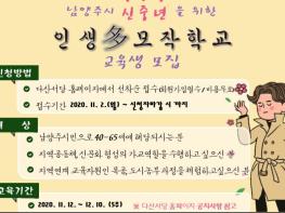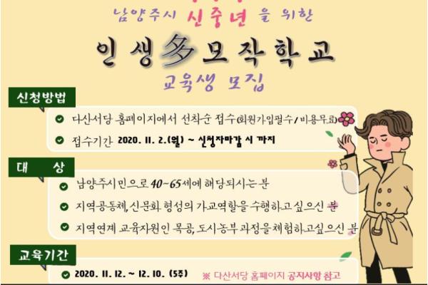 남양주시 평생학습원은 11월 12일부터 5주간 40-65세에 해당하는 남양주시민 20명을 대상으로 인생多모작학교 2기 과정을 운영한다.