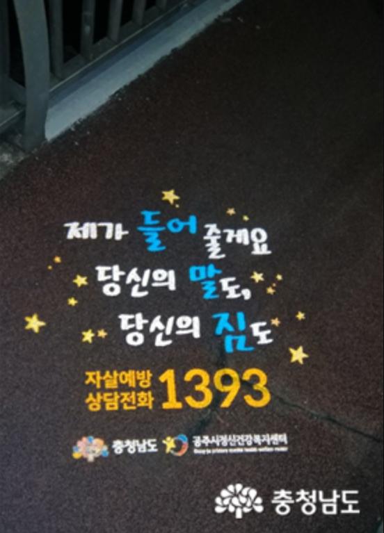 한편 도는 지난 8월에도 자살에 대한 인식 개선 및 생명존중 문화 확산을 위해 도시형 자살예방사업의 일환으로 천안 자살빈번지역 5개 동에 로고젝터를 설치하고, 자살 예방 희망메시지 등을 집중 홍보한 바 있다.