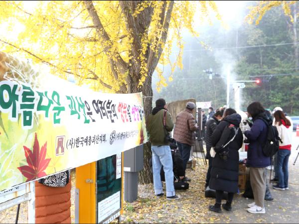 문광저수지 은행나무길이 황금빛으로 물들며 관광객들의 발길이 끊이지 않는 가운데, (사)한국예총괴산지회와 괴산사진작가협회 회원들이 힘을 모아 무료봉사에 나서고 있어 눈길을 끌고 있다.