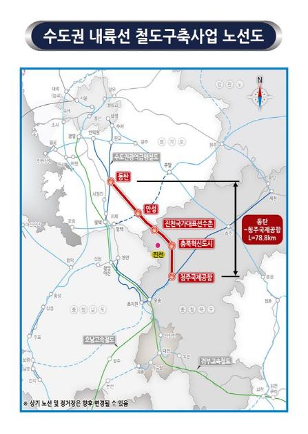 한편 수도권 내륙선은 약 2조 3천억 원이 소요되는 대규모 국책사업으로, 청주공항-충북혁신도시-진천국가대표선수촌-안성-동탄 잇는 총 연장 78.8km의 준고속철도로 해당 구간을 34분 이내에 주파할 수 있는 노선이다.