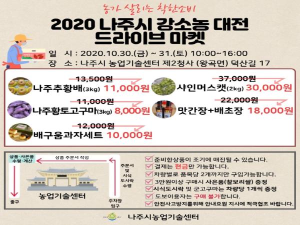 나주시(시장 강인규)는 30일부터 31일까지 양일 간 10시부터 16시까지 농업기술센터 주차장에서 지역 농산물 판매 활성화를 위한 ‘드라이브 마켓’을 운영한다고 27일 밝혔다.