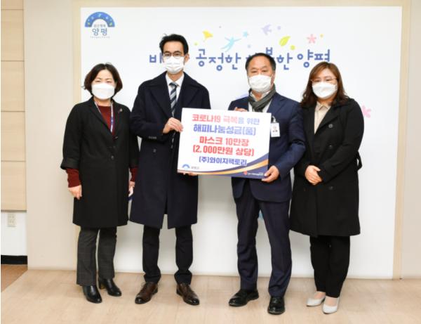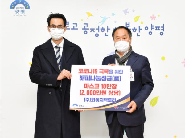 양평군은 ㈜와이지팩토리에서 코로나19 확산 방지를 위하여 마스크 10만장을 기탁했다는 훈훈한 소식을 밝혔다.