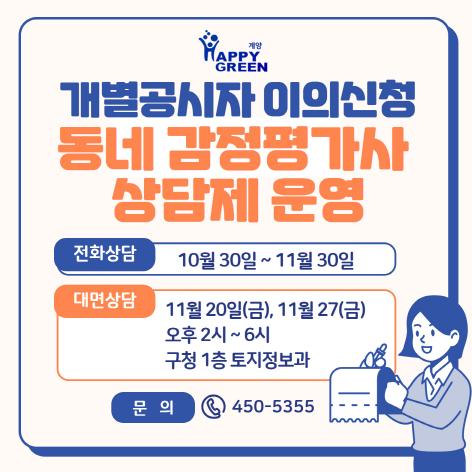 전화상담은 개별공시지가 이의신청 기간인 10월 30일부터 11월 30일까지 가능하다. 대면상담은 11월 20일(금), 11월 27일(금) 오후 2시부터 6시까지 구청 1층 토지정보과에서 운영한다.