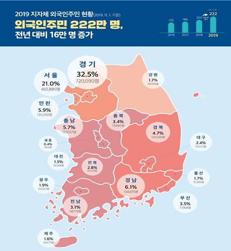 행정안전부가 통계청의 인구주택총조사 자료를 활용하여 발표한『2019 지방자치단체 외국인주민 현황(2019.11.1. 기준)』에 따르면, 우리나라에 거주하는 한국국적을 가지지 않은 자?한국국적 취득자?외국인주민 자녀(이하 ‘외국인주민’)는 모두 221만 6,612명인 것으로 조사됐다.