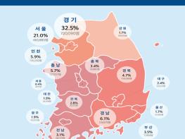 거주 지역별로 보면 경기 72만 90명(32.5%), 서울 46만 5,885명(21.0%), 경남 13만4,675명(6.1%) 순으로 외국인주민이 많이 거주하고 있으며, 수도권(서울?경기?인천)에 59.4%가 거주하고 있는 것으로 나타났다.