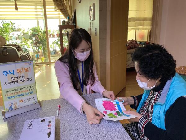 ‘두뇌톡!톡! 방문서비스’는 바깥활동이 어려운 치매고위험군 어르신 20명을 대상으로 주1회 총 6회를 직접 방문하여 일상생활관리, 건강관리, 현실인식훈련, 회상?작업?미술치료, 전산화 인지재활 프로그램, 워크북 등 다채로운 프로그램을 제공하여 치매 예방과 기억력 및 인지기능 향상에 도움을 주고 있다.