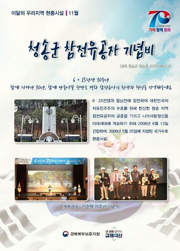 경북북부보훈지청(지청장 우진수)은 2020년 11월 이달의 우리지역 현충시설로 청송군 참전유공자 기념비(경북 청송군 청송읍 금곡리 864-3)를 선정한다고 밝혔다.