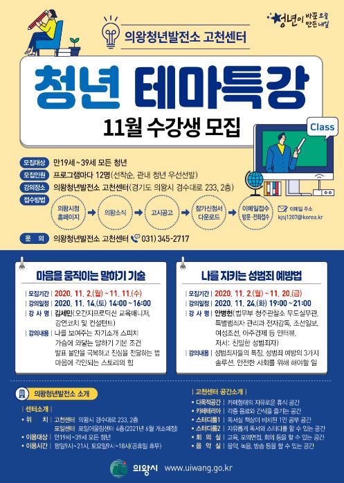 의왕청년발전소 고천센터에서 청년들의 취업과 안전을 위한 특강 프로그램인‘청년 테마특강’11월 수강생을 모집한다.