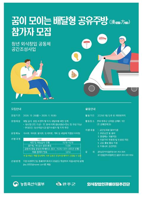 신청 자격은 완주에 거주하는 만39세 이하의 외식 창업을 희망하는 청년팀(청년 장년팀)과 배달대행을 희망하는 업체 및 청년이라면 누구나 지원할 수 있다.