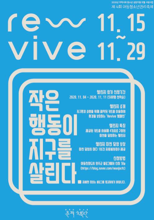지역별 13명으로 구성된 청소년축제기획단(단장 강지향, 고산고)은 코로나19 상황으로 인해 비대면 축제를 기획했으며, 내달 중 REVIVE 환경챌린지를 운영해 작지만 큰 실천으로 지구환경을 다시 생각하자는 챌린지를 운영한다.