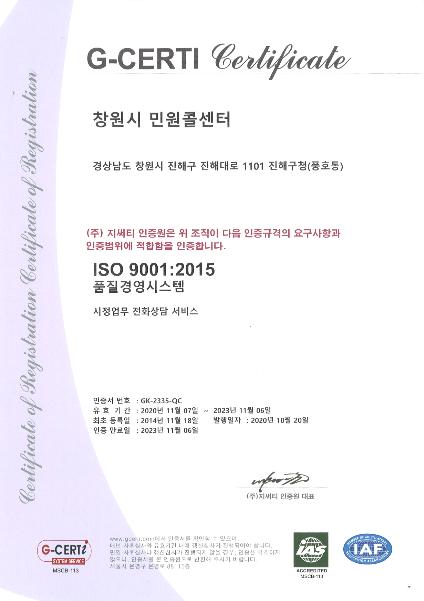 창원시 민원콜센터는 2014년부터 ISO 9001 품질경영시스템을 인증 받아, 7년 연속 심사를 통과했으며 시정업무 전화민원 서비스 분야 전반에 걸쳐 체계화·표준화를 이루고 고객중심의 서비스 체계를 갖추고 있다.