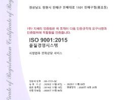 ISO 9001는 국제표준화기구(International Organization for Standardization)에서 제정한 품질 경영시스템에 대한 국제표준규격으로, 제품의 서비스 체계가 국제기준의 요구사항을 만족하고 지속적으로 관리·유지되는 인증으로 리스크관리, 이해관계자 기대사항, 성과중심 등 최신 품질경영 이슈를 적극 반영한 것이다.