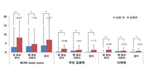학습능력 평가를 위한 간이인지척도(BCRS, Brief cognitive rating scale), 주의집중력, 이해력 검사 결과에서도 모두 밥 중심 아침 식사군이 결식보다 점수가 각각 3배, 4.7배, 15.6배 높았다.