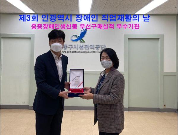 인천중구시설관리공단은 장애인생산품 구매가 중증장애인의 일자리 창출로 이어지는 만큼 중증장애인들을 고용하는 직업재활시설의 생산품을 우선적으로 구매하여, 중증장애인의 자립 기반 마련을 위하여 적극적으로 노력하였다.