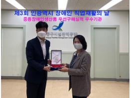 인천중구시설관리공단(이사장 김옥자)은 제3회 인천광역시 장애인직업재활의 날(1030)을 기념하여 중증장애인생산품 우선구매실적 법정구매비율 달성 우수기관으로 선정되어 2회 연속 기관 표창을 수상하였다.
