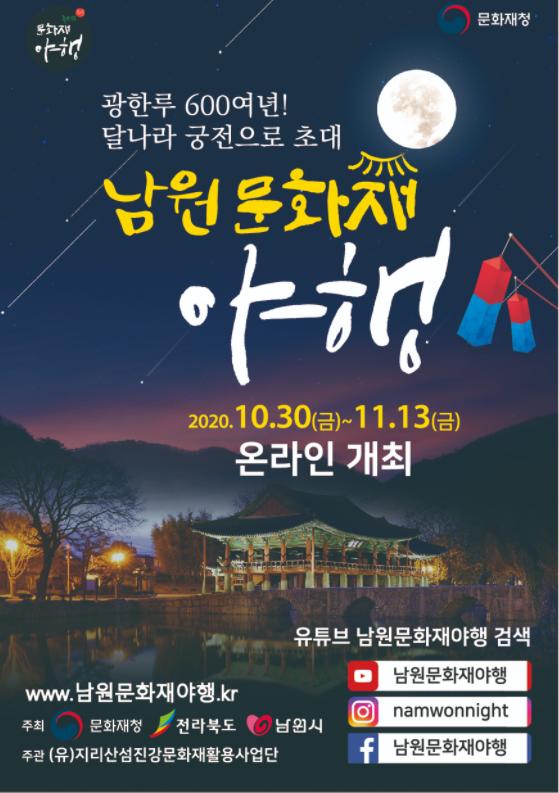 당초 3일간 오프라인으로 개최할 예정이었으나 코로나19 확산방지를 위해 온라인 축제로 전환, 2주간(10.30.~11.13.) 진행하기로 하였다. 남원 문화재야행은 지난해 2020 문화재청 공모사업에 선정되어 올해 처음 시행하는 사업으로, 밤에 즐길 수 있는 여덟 가지의 주제를 야경(夜景)·야로(夜路)·야사(夜史)·야화(夜畵)·야설(夜說)·야시(夜市)·야식(夜食)·야숙(夜宿) 8야(夜)로 펼쳐 그 중 코로나19로 야숙(夜宿)을 제외한 7야(夜)를 선보인다.